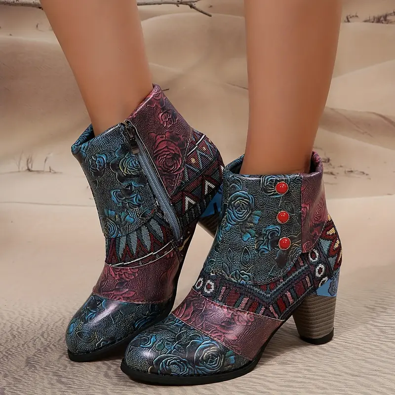 Bohemian Floral Embossed Ankle Boots for Women